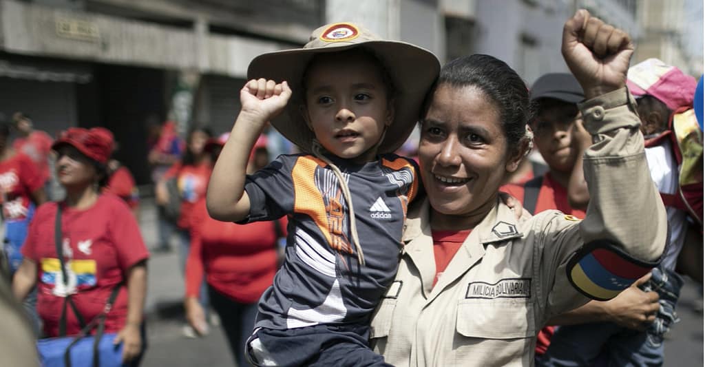 A woman of the National Bolivarian Militia carrying her daughter during a pro-government march on International Women’s Day in Caracas, Venezuela Sunday.